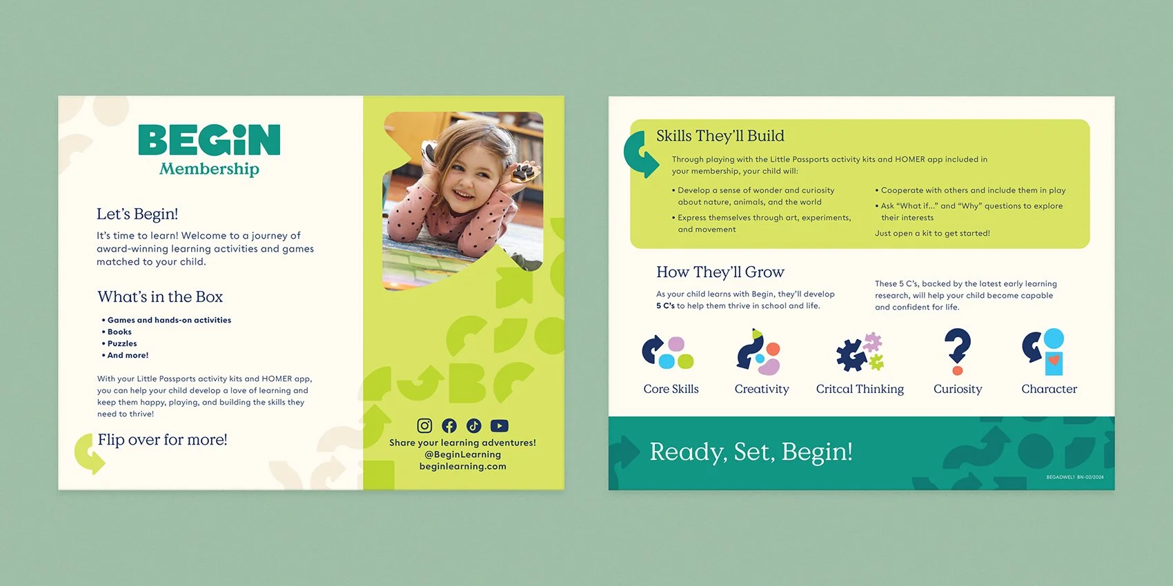 I designed promotional materials for Begin’s family of brands, which enable children to learn through play.