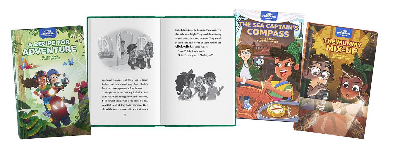 Illustrated chapter books are offered as a premium add-on to the subscription. Our original characters explore the globe, meeting friends and encountering scenarios that tie back to each monthly kit. I lead the book design process, working with typesetters and providing art direction for over 360 narrative illustrations across the 12-book series.